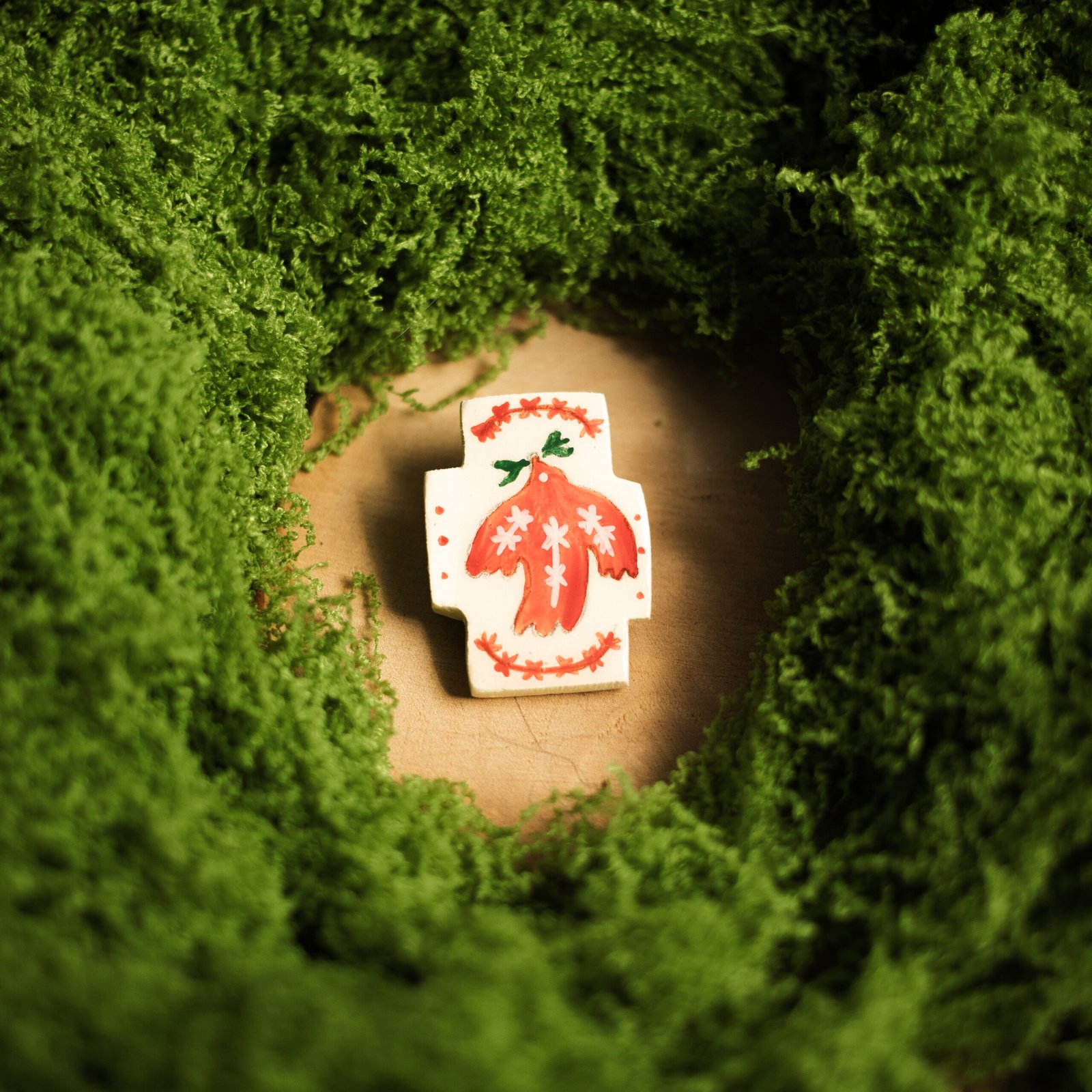 modelată din pastă cu uscare la aer, pictată cu acril și tempera cu emulsie ou, glazurată cu rășină UV