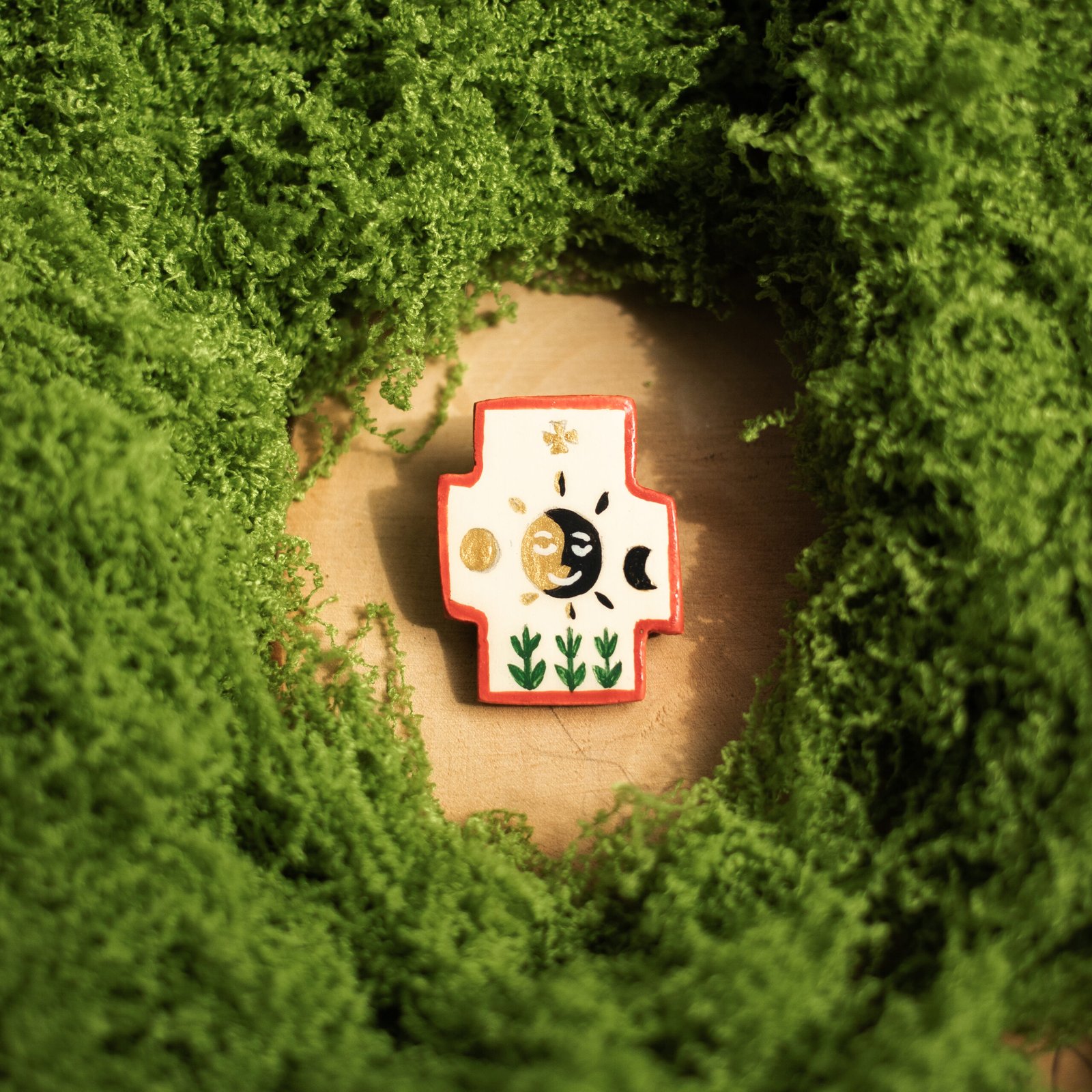 Pictată manual cu migală și inspirație arhaică, acest model ilustrează dualitatea cosmică dintre zi și noapte, într-o reprezentare armonioasă a Soarelui și Lunii unite într-un chip dublu. Deasupra, o cruce strălucește ca un simbol al echilibrului divin, iar dedesubt, cele trei vlăstare verzi sugerează continuitatea vieții și legătura cu pământul.