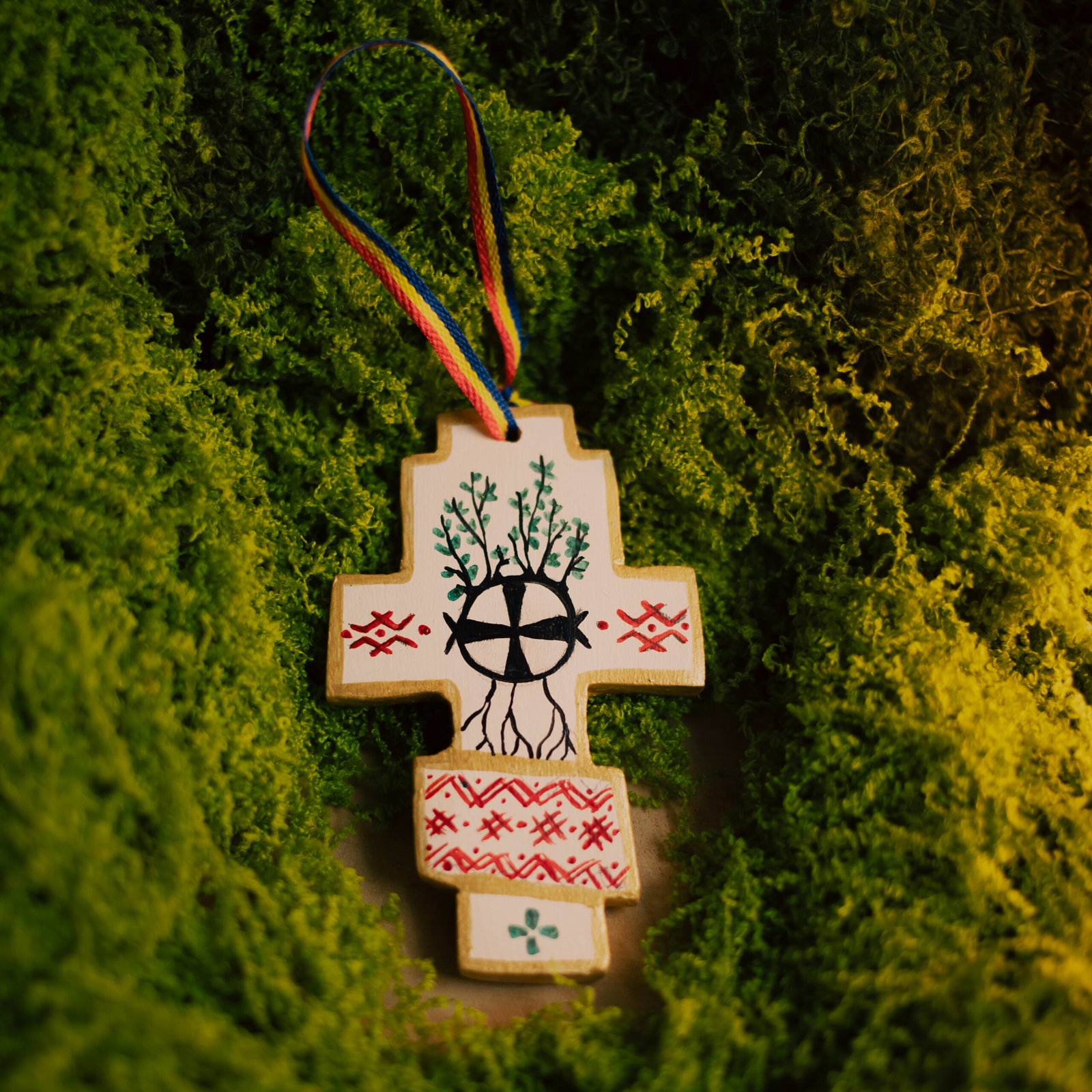 Această cruciuliță decorativă este modelată și pictată manual. În centrul compoziției se află crucea, înconjurată de vlăstare verzi, ce evocă renașterea, legătura cu natura și viața veșnică. Simbolizează nădejdea prin rădăcinile care coboară și ajung la motivele tradiționale pictate în roșu. Cruciulița reprezintă conexiunea dintre credință și tradiție, legătură bine strânsă prin simbolul rădăcinilor.