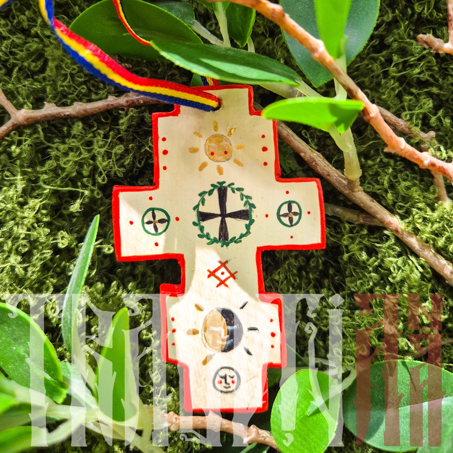 Fiind înconjurată de o coroană cu lauri, cruciulița reprezintă Crucea ca simbol al biruinței. În plan superior și inferior, apar elemente de inspirație populară: soarele cu chip zâmbitor precum și luna, simbolurile reprezintă lauda pe care acești astrii îi aduc lui Dumnezeu. Simbolul tradițional geometric amintește de motivele cusute pe straiele vechi, iar conturul roșu care încadrează cruciulița este des întâlnit în iconografie ca element decorativ de balansare a compoziției.