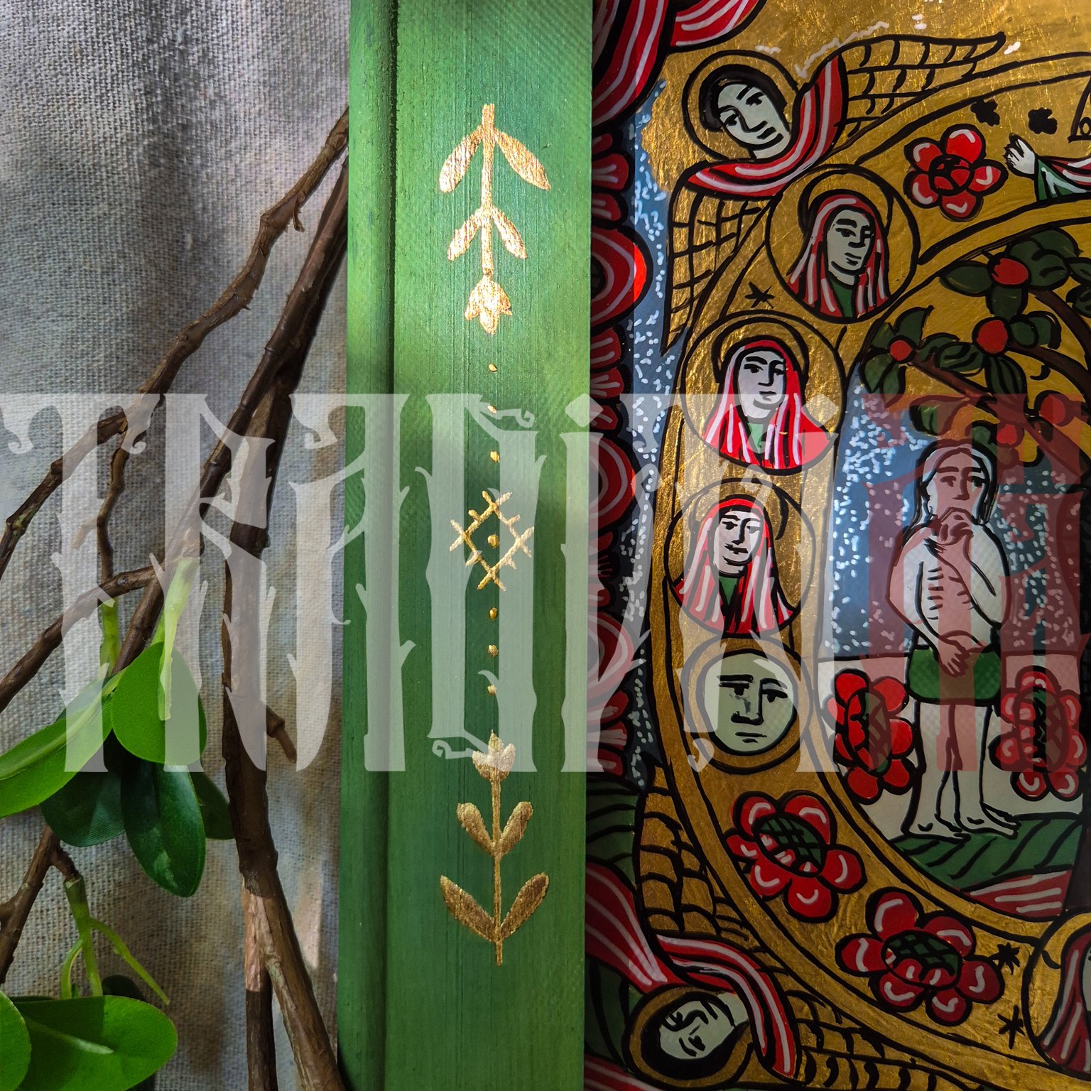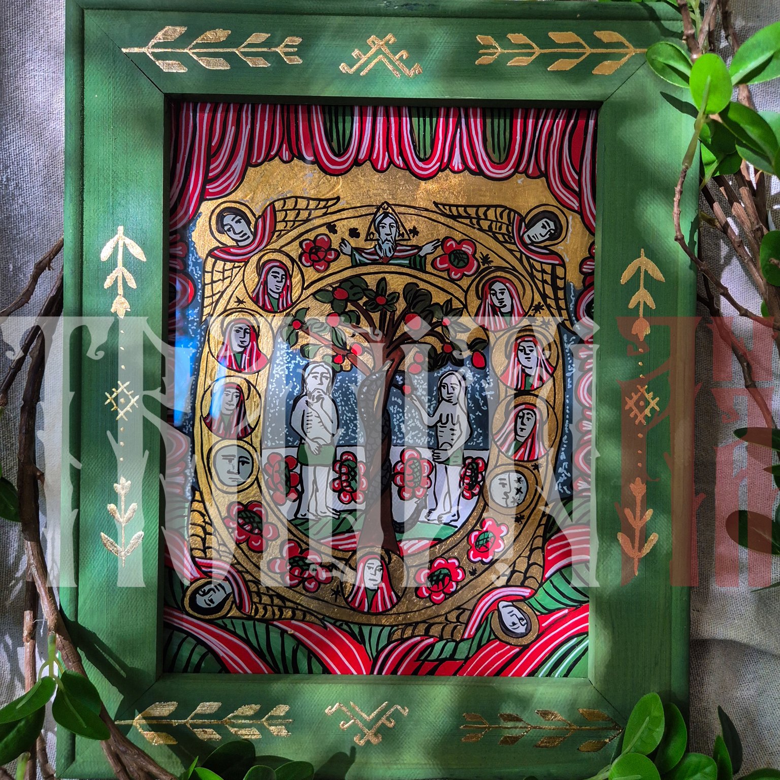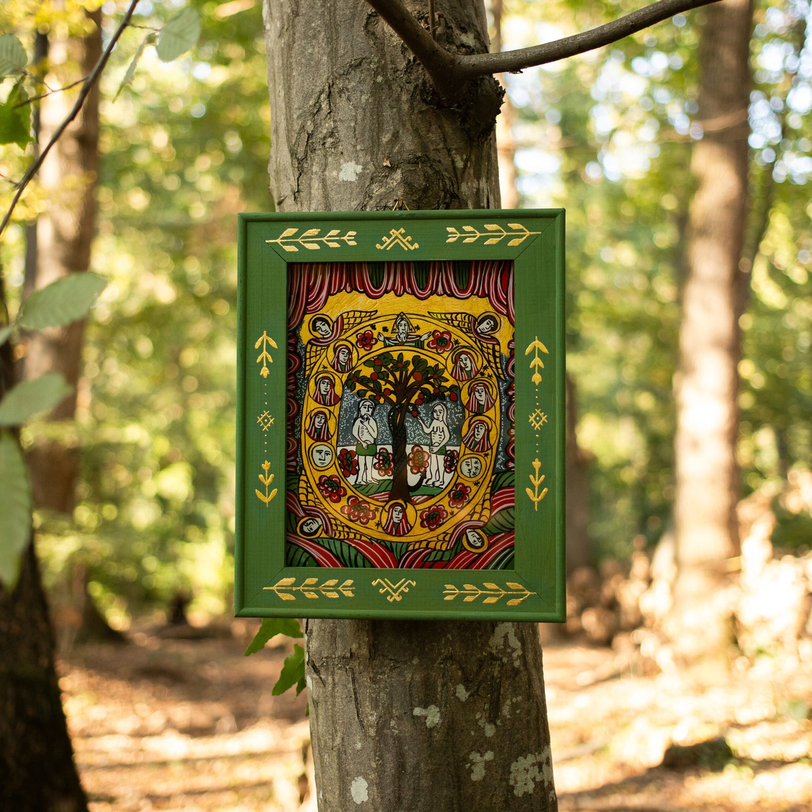 Icoană pe sticlă – Adam și Eva în Grădina Raiului