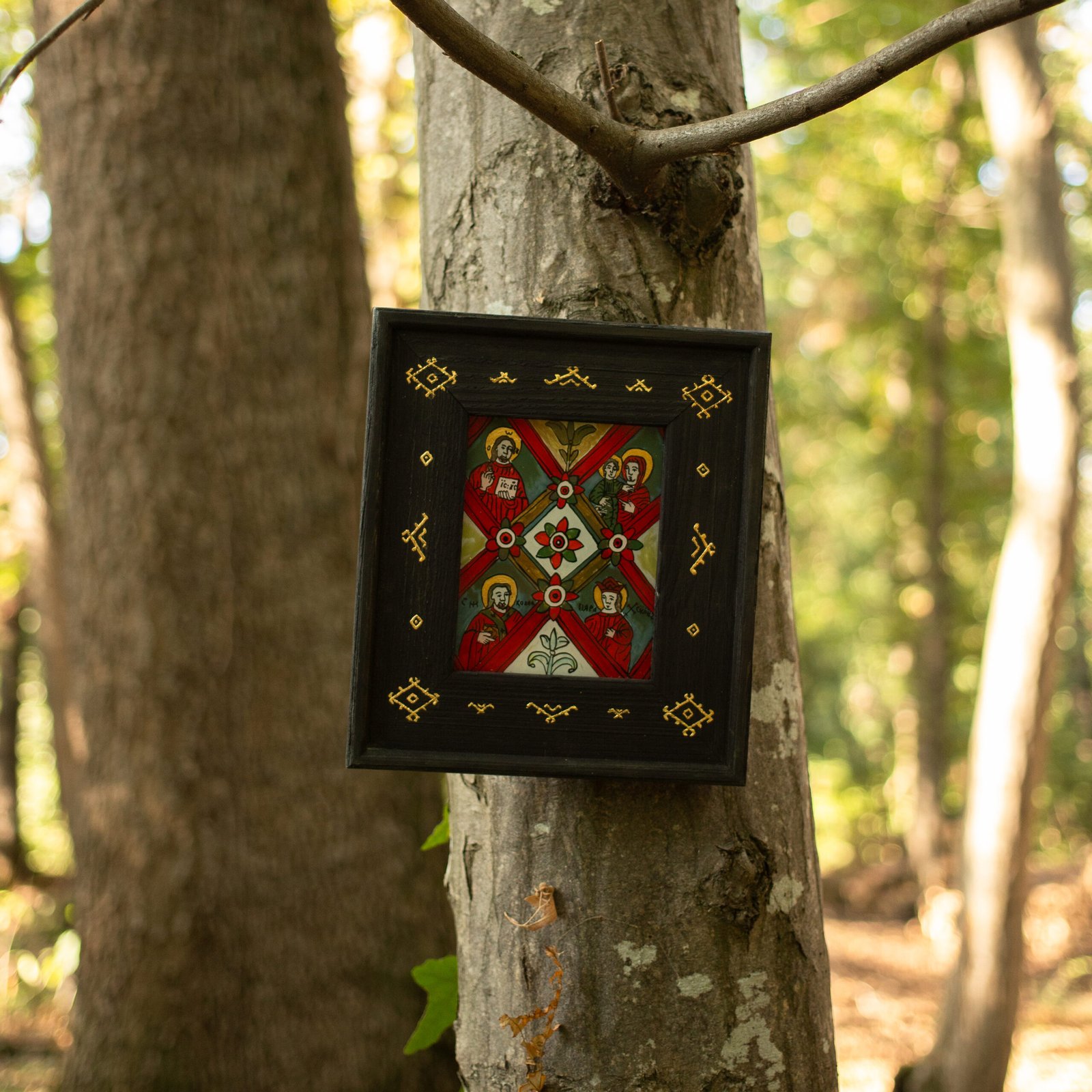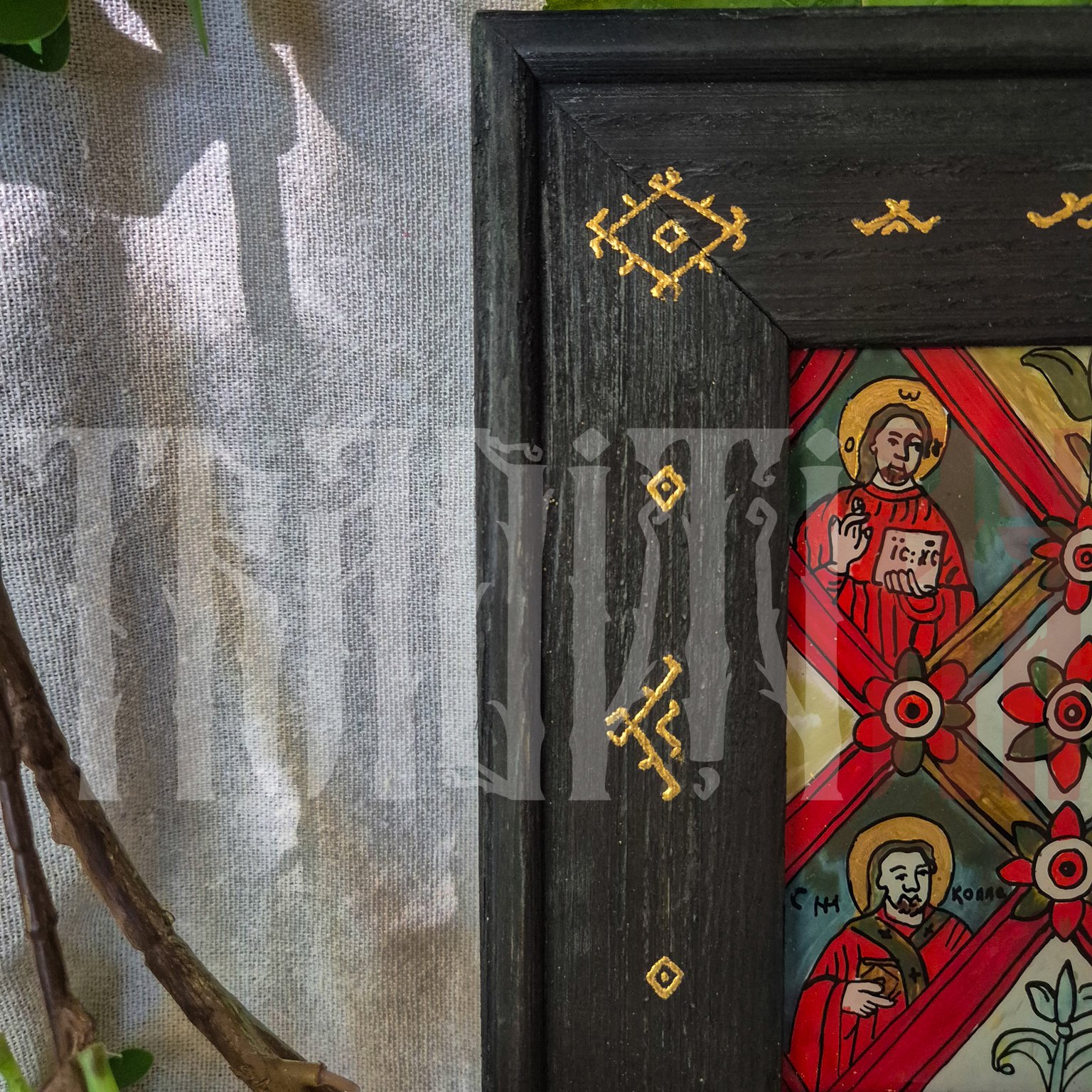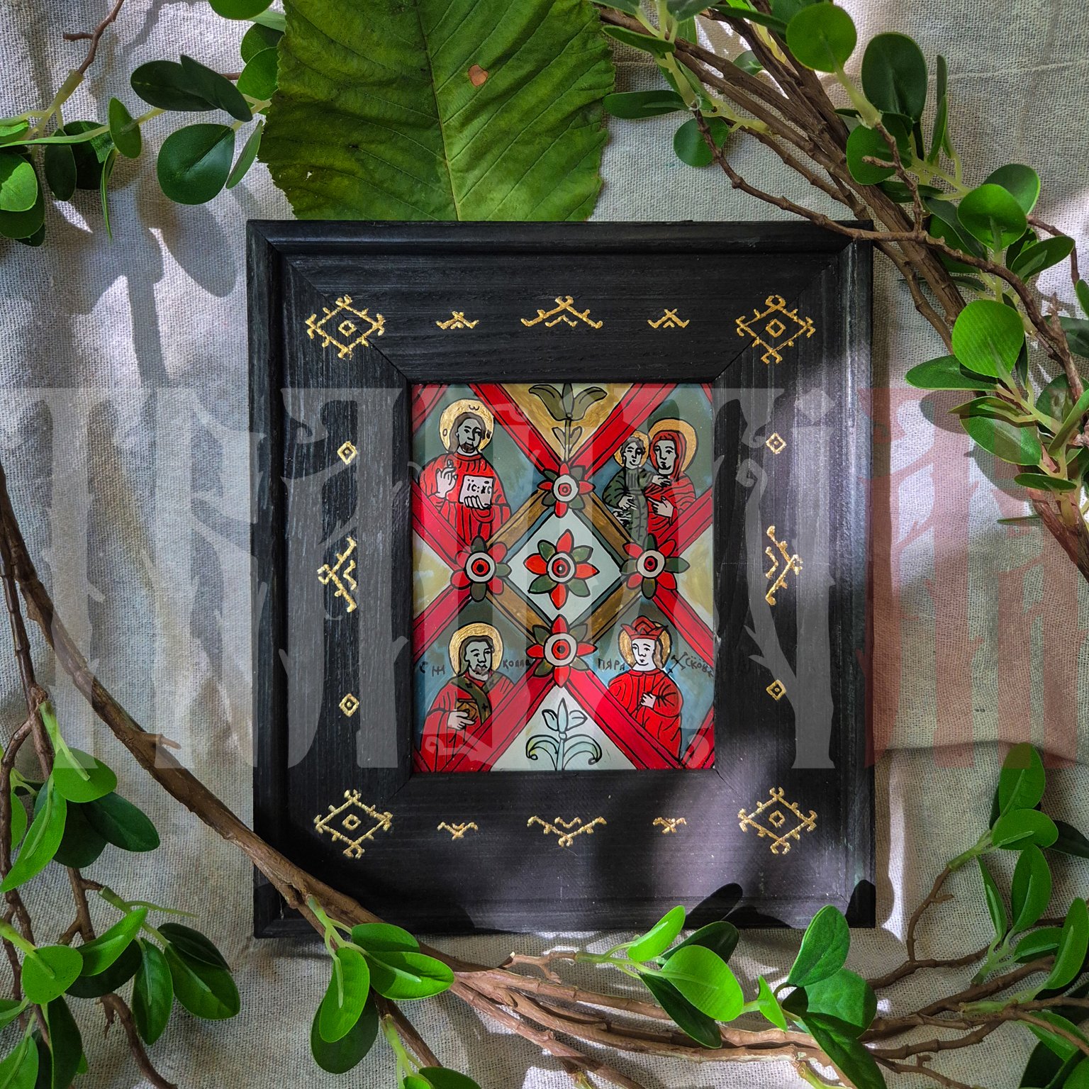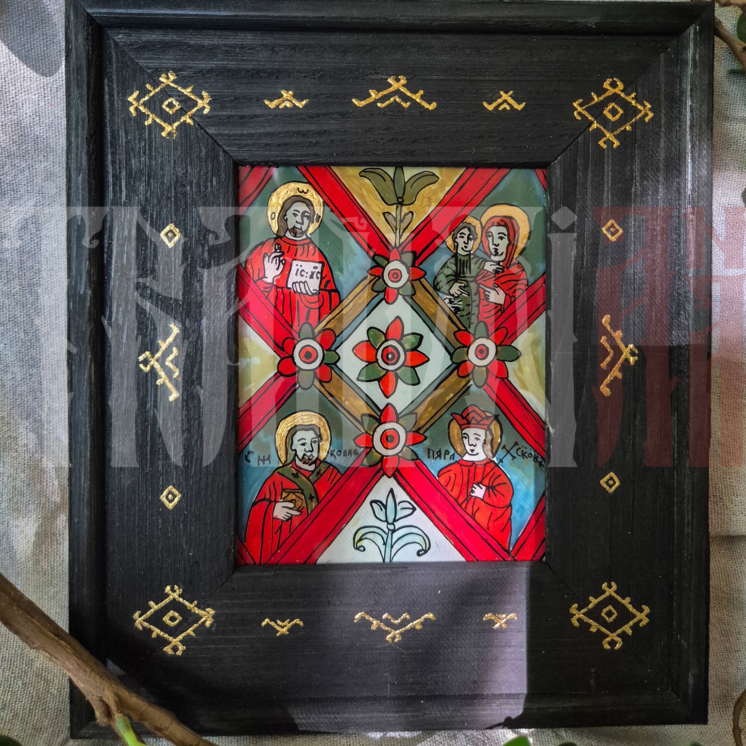 | Tehnică | tempera cu emulsie de ou, rama icoanei este tratată și vopsită cu baiț de lemn și decorată cu slagmetal (imitație foiță de aur). |